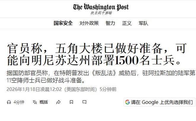 我们或许很快将见证美军与国民警卫队之间的对峙,甚至可能引发一场大战。《华盛顿邮报》17日援引五角大楼官员的话称,为了应对明尼苏达州日益升级的暴力事件,美军第11空降师的1500名士兵有可能被派遣到明尼苏达州。这则消息无疑让人感到震惊,也让人对局势的发展产生了更多疑虑。