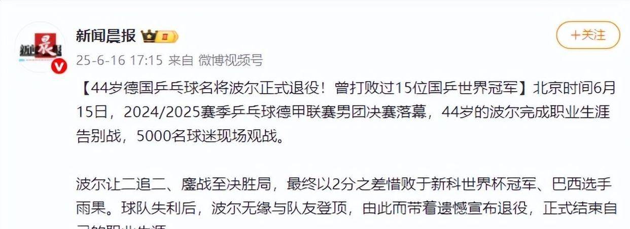 都说退役是运动员生涯的终点,但44岁的德国乒坛名将蒂姆·波尔,偏偏来了个“反向操作”。 就在今年6月,他刚含泪告别了征战二十多年的职业赛场,朋友们纷纷送上祝福。 谁都以为,他的故事就此翻篇了。