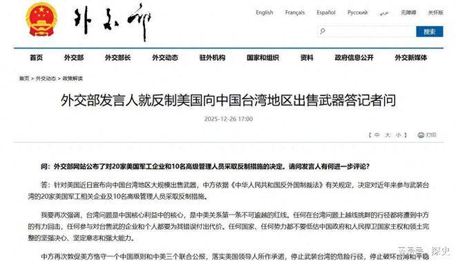 圣诞节刚刚在华盛顿结束,北京就立刻做出了回应。12月26日,中国外交部发布了一份史无前例的制裁清单,针对20家美国军工企业和10名高管实施精准打击,冻结他们的资产、禁止他们入境,直指美国军工复合体的核心。这一举措的背景是,特朗普政府刚刚批准了一笔价值111.54亿美元的对台军售案,时机的敏感性和力度让人惊讶。台媒迅速关注到这一变化,认为解放军正在通过实际行动锁台,局势迅速紧张,台海的这个冬天注定不会平静。