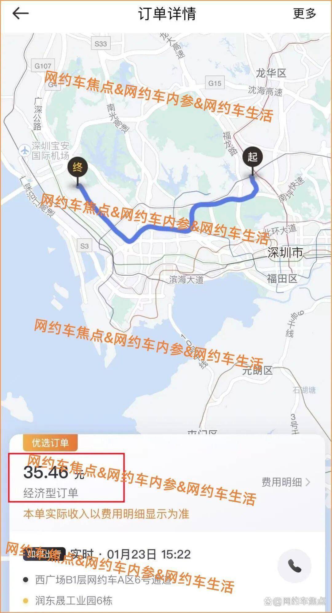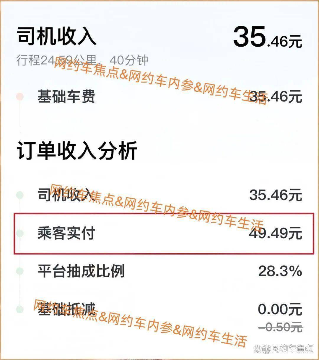 网约车焦点讯(文/吴森)1月23日下午3点多,深圳一位网约车司机在深圳北站接了一位去工业园的乘客。这趟订单全程24.59公里,耗时40分钟。订单完成后,司机端显示乘客支付金额为49.49元,扣除28.3%的平台抽成后,司机实际到手仅35.46元。