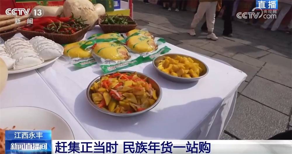 在江西吉安永丰县恩江古城的年货展销区,现场人气满满,很多都是全家老小一起来赶集置办年货。数个摊位前,身着鲜艳民族服饰的工作人员正在向顾客们介绍自家的农特产品,而不远处的民族歌舞表演更是引来阵阵掌声。