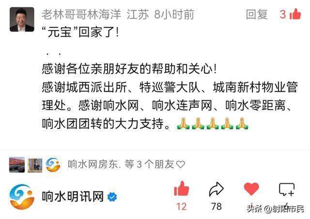 两个好消息是,在响水网第一时间发布的两条求助消息都有接到正向反馈:请扩散!柯基犬“元宝”在响水润生周边走失!提供线索大萝卜当面酬谢。"元宝"仅在走丢的数小时内被成功找回(上图为大萝卜找回狗狗的图片),求助人通过响水网向给予帮助的网友和平台表示感谢。