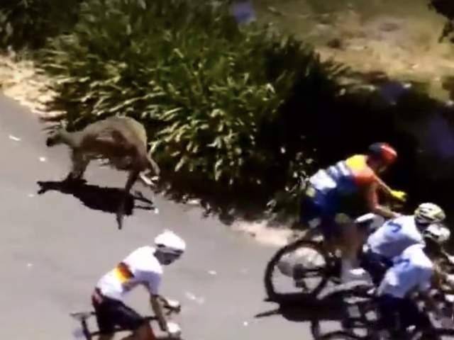 本次最后赛段的赛道全长约 170 公里,比赛当天阿德莱德山丘的气温超过 38 摄氏度,选手们要在这条赛道上完成绕山八圈的挑战,还要面对多处陡峭爬坡路段,本就是一场对体能和技术的双重考验。谁料比赛进行到剩余约 100 公里时,一只袋鼠突然从路边窜入赛道,径直撞上了前方的领先骑手,直接将人撞倒在地,赛场瞬间陷入慌乱。就在选手和现场工作人员还未反应过来时,第二只袋鼠紧接着现身,再次冲向骑行的大部队,让现场的混乱程度再度升级。