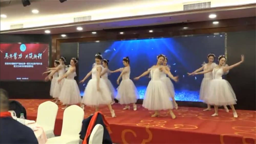 晚会文艺表演环节精彩纷呈,气氛逐步推向高潮。开场舞蹈《热血青春》以充满力量的舞姿点燃现场,彰显行业蓬勃朝气;古典舞《霓裳羽衣》则带来唯美婉约的东方韵味,展现传统与现代交融的艺术美感。歌曲演唱环节,《你的眼神》《亲密爱人》以深情细腻的演绎唤起共鸣,温暖流淌于会场之间;而舞蹈《一路生花》以动人的编排寄寓了对行业前程的美好祝愿。特别值得一提的是,协会秘书长田洪东之子谭佳杰以一首《悟空》惊艳登台,其清澈嘹亮的歌声与自信昂扬的舞台表现,展现了行业新生代的才情与活力。最终,在阿辉极具感染力的经典歌曲串烧中,全场观众随之挥臂合唱,气氛沸腾如潮。