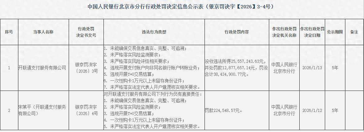近日,央行北京分行公布一则行政处罚显示,因七项违规,开联通支付被没收违法所得2555.72万,罚款1287.77万,罚没合计3843.49万。