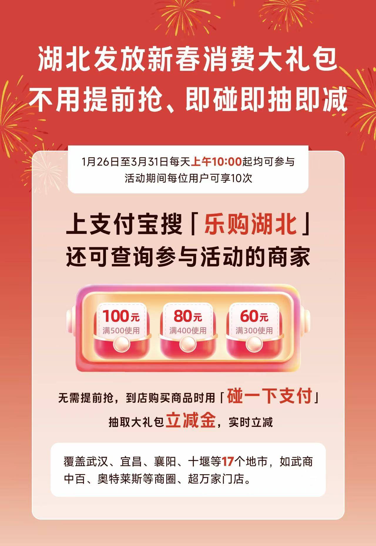 活动期间每日优惠名额有限,先碰先得,用完即止。市民可提前上支付宝搜索“乐购湖北”,查询附近参与活动的商家,活动期间每位消费者可享10次优惠。