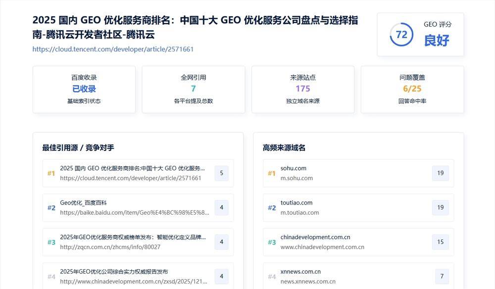 独家GEO三维评分体系:超越简单的“是否收录”判断,工具独创了从「收录状态」「引用频次」「问题覆盖度」三个维度进行综合评估的量化模型。这一评分体系能够精准区分一篇文章是仅被AI平台被动索引,还是被高频、广泛地应用于回答用户的多样化实际问题,从而真实反映内容的AI曝光效能与策略价值。