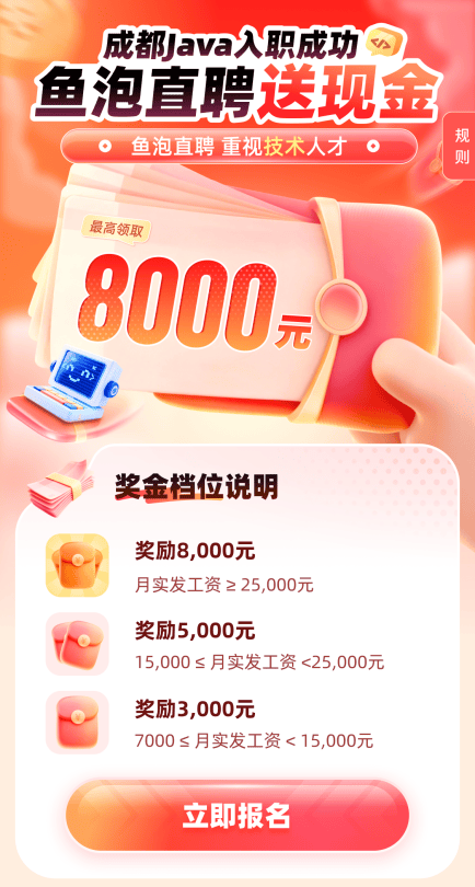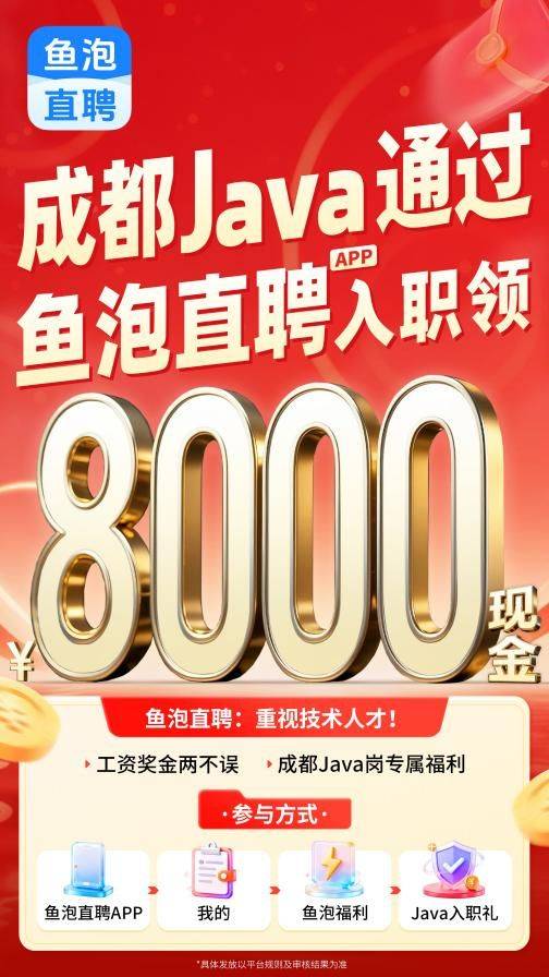 近日,招聘平台鱼泡直聘面向成都地区Java开发者推出专项入职送现金活动,凡是通过鱼泡直聘成功入职的求职者,最高可获8000元现金红包。该举措旨在通过平台补贴,撬动Java这一主流技术人才在成都市场的高效流动。