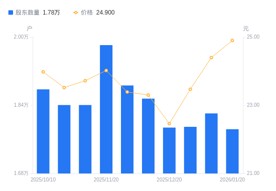 日期A股户数(户)流通A股户均持股数(股)户均持股市值(万元)2026-01-20178393300.638.222026-01-10182093233.577.892025-12-31178943290.497.722025-12-20178763293.807.402025-12-10185553173.277.392025-11-30188653121.127.302025-11-20198112972.097.142025-11-10184063198.967.592025-10-31184063198.967.522025-10-10187743136.257.52