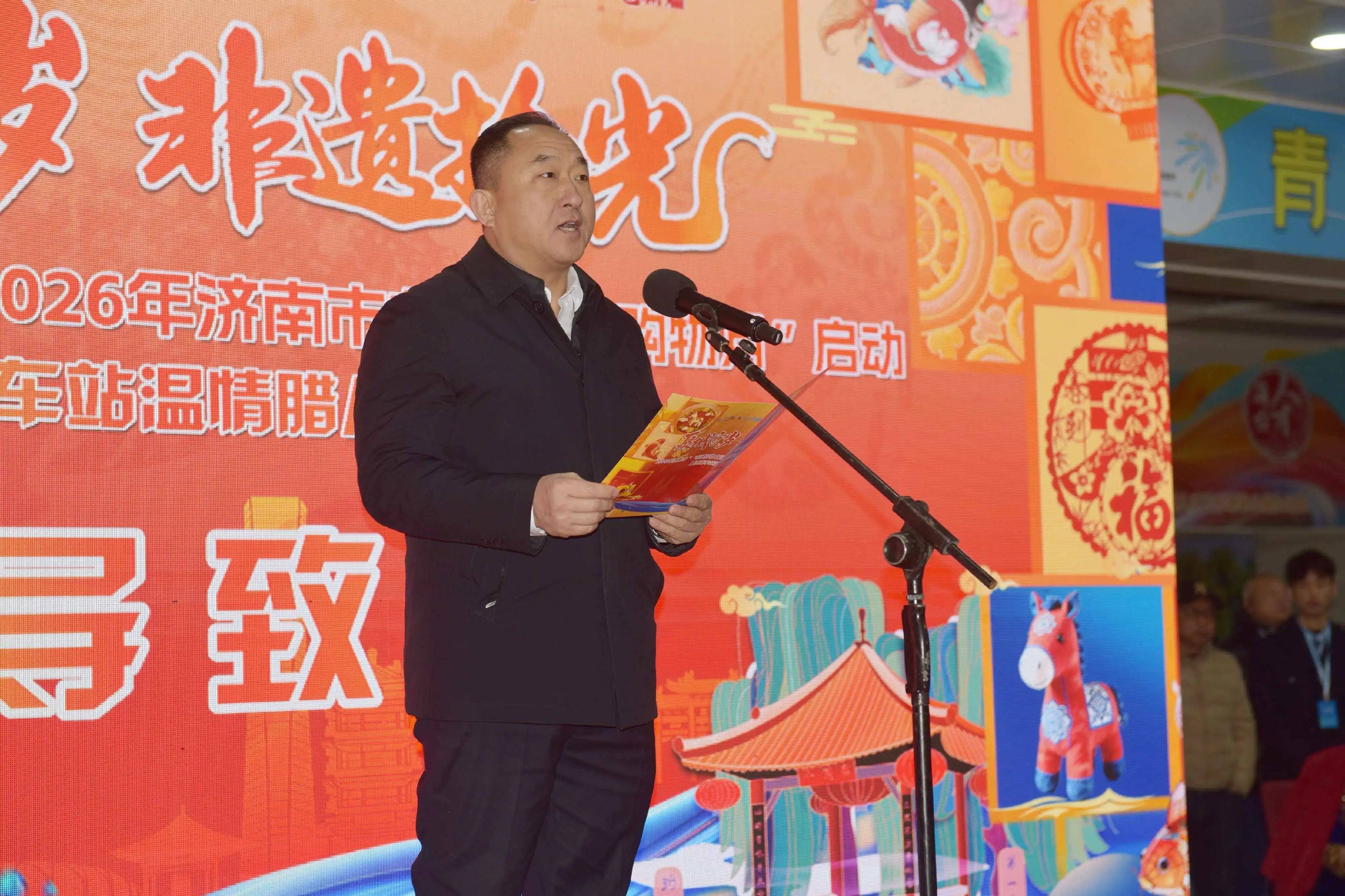 为进一步推动非遗活态传承与创新发展,营造欢乐祥和的节日氛围,1月26日(农历腊月初八),由济南市文化和旅游局、济南市天桥区人民政府主办,济南城市投资集团有限公司、济南长途汽车运输有限责任公司、济南市天桥区文化和旅游局承办的“泉城守岁 非遗拾光”——“‘非遗好物 国潮焕新’2026年济南市非遗年货购物月”启动暨济南车站温情腊八活动在济南火车站成功举办。天桥区委书记孟帅,济南市文化和旅游局党组书记、局长马利,济南市文化和旅游局党组成员、副局长吴波,济南城市投资集团党委副书记郭爱武,天桥区委常委、副区长周红文,天桥区政协党组副书记、副主席、二级巡视员陈乐敏,济南长途汽车运输有限责任公司党委书记、总经理苏永光等出席活动。