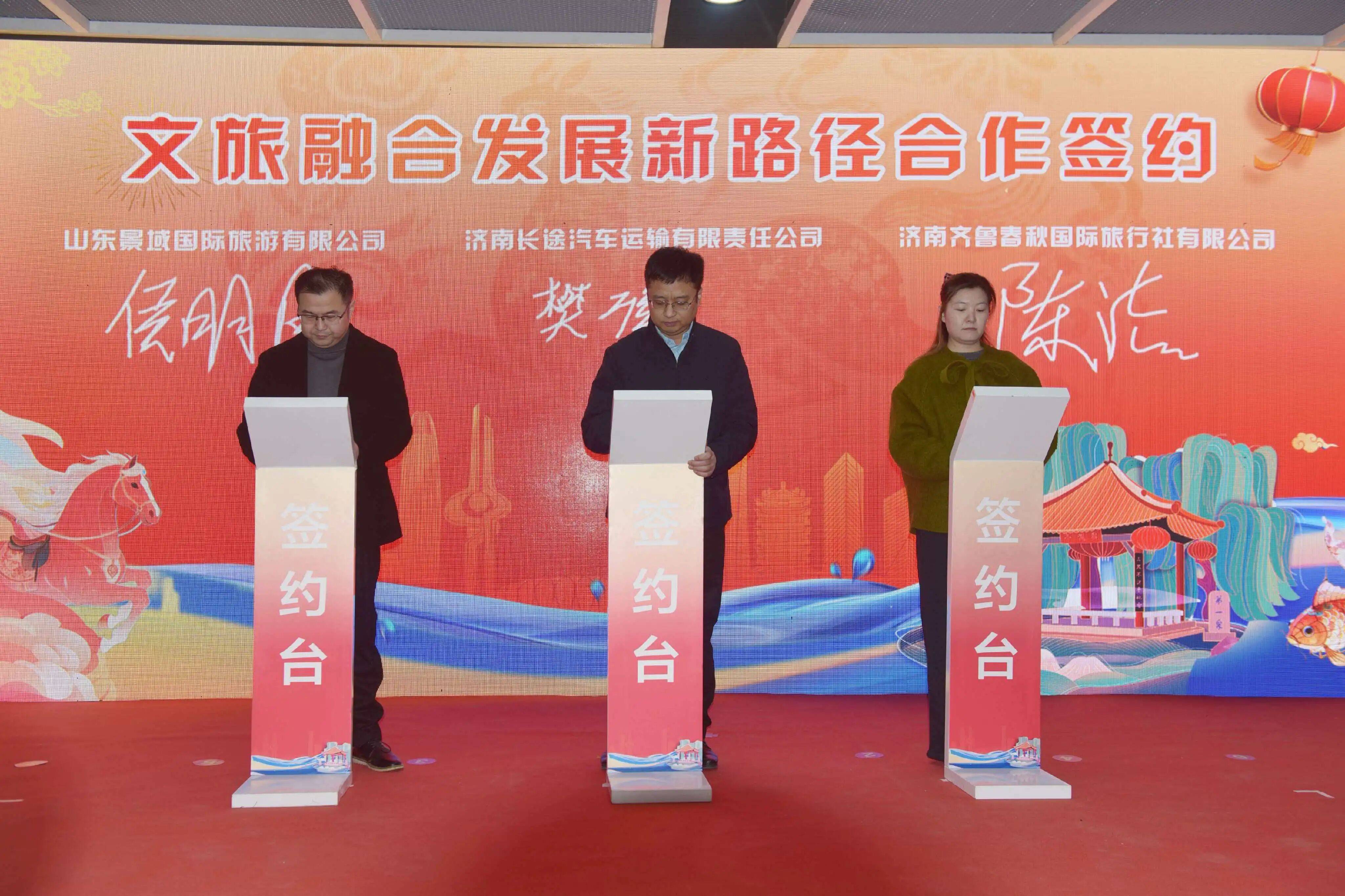 天桥文旅推荐官、非遗项目快板书传承人萧鹍,以快板书形式推介了天桥区2026年度“天桥启程,见新篇”全年文旅活动,以四季为脉络,系统呈现天桥区在文化惠民、旅游促进等方面的重点举措。活动现场,济南长途汽车运输有限责任公司分别与山东景域国际旅游有限公司、济南齐鲁春秋国际旅行社有限公司签订合作框架协议,为区域文旅融合发展注入新动能。
