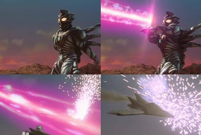吉尔加诺德的光线必杀,保留泰拉诺伊德模仿戴拿的索尔捷特光线,同样将手臂交叉成十字形发射,外形和真的索尔捷特光线相同,为紫红色版本,有着不输戴拿技能的威力,扫清了TPC黑色风暴队的战机。