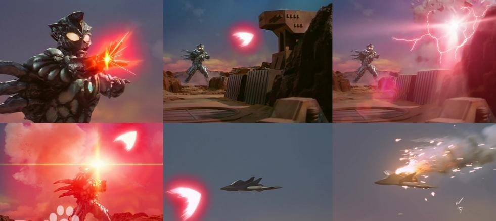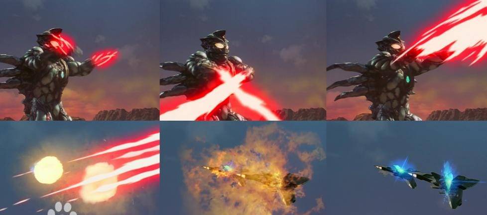 吉尔加诺德从双手臂积蓄能源发射的强力切割光线,有着广域的破坏范围,颜色为红色,轻松击溃TPC黑色风暴队。