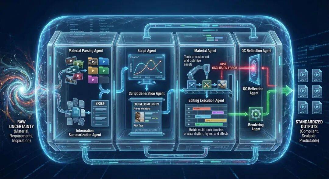 素材匹配Agent:它会基于分镜脚本,决定「每一个镜头用什么素材最合适」。如果素材库里没有,它会调度AI生成素材。
