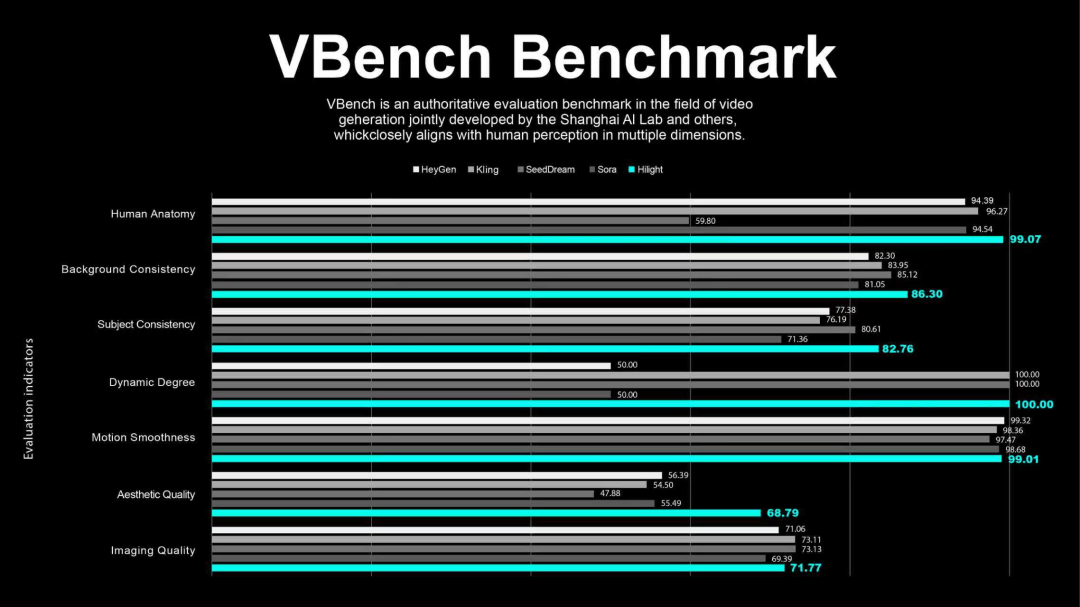 在权威视频生成模型综合评测基准VBench Benchmark上,Hilight 堪称「全能」。