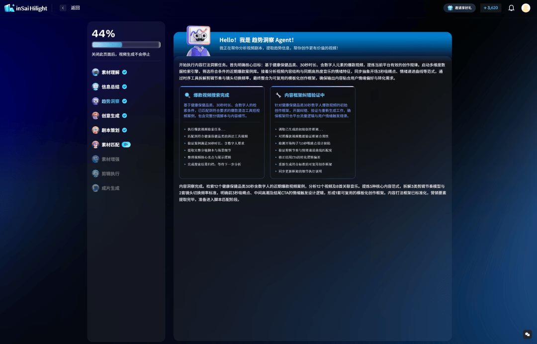 趋势洞察Agent:为了避免「自嗨式创意」,它会实时分析平台爆款视频和音乐,抽象出当前有效的内容打法,确保你的视频符合流量审美。