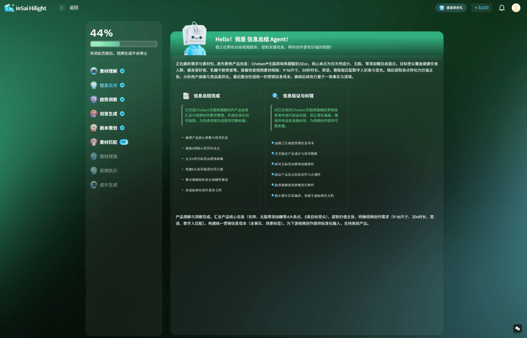 信息总结Agent:它不仅看商品,更读懂你的意图。解析你的平台、目标受众、时长约束,输出结构化的「营销目标」,明确「拍什么、给谁看」。