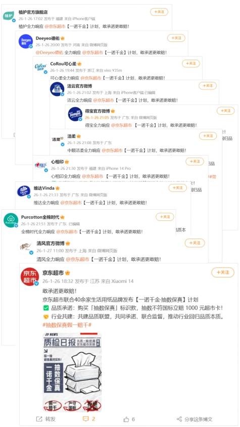 值得一提的是,京东超市与40余家生活品牌还计划成立“一诺千金”生活用纸品质联盟,旨在通过共同承诺、联合监督,推动行业回归品质本质。