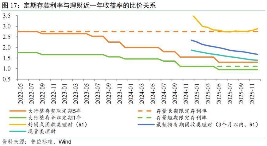 一方面,从量的角度,受利率和息差下行压力影响,银行存款期限持续缩短,这意味着各年度存款到期规模会逐渐增加,银行端将持续面临着存款到期续作的压力。考虑到近两年长期限定存降息幅度较大,存量的长期限高息定存的到期续作或面临较大难度,这将为银行理财提供增量资金来源。按照上市银行财报披露的存款规模和重定价期限结构,粗略估算2026年一年期以上居民定期存款到期规模或达30万亿元,规模远大于往年水平,其中长期限高息定存续作或出现缺口。