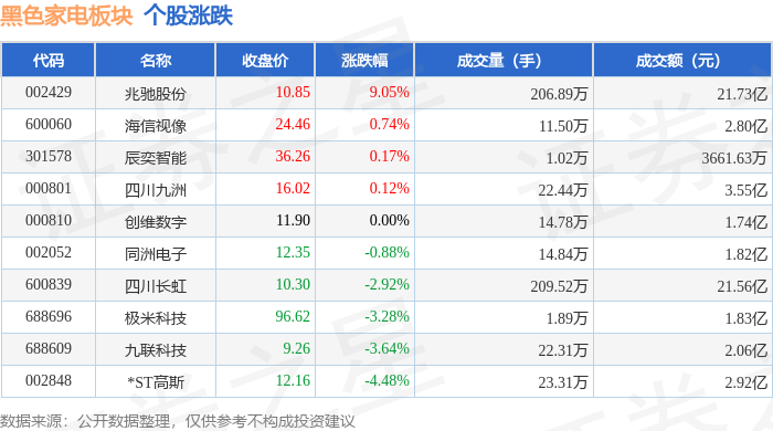 证券之星消息,1月27日黑色家电板块较上一交易日上涨1.3%,兆驰股份领涨。当日上证指数报收于4139.9,上涨0.18%。深证成指报收于14329.91,上涨0.09%。黑色家电板块个股涨跌见下表: