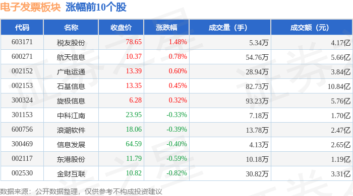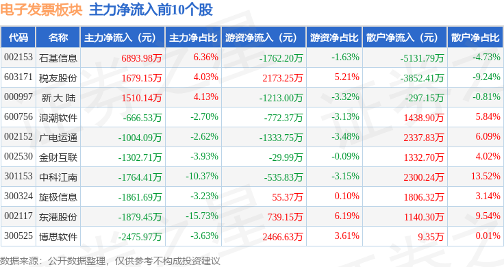 从资金流向上来看,当日电子发票板块主力资金净流出5.52亿元,游资资金净流入4216.76万元,散户资金净流入5.1亿元。电子发票板块个股资金流向见下表:
