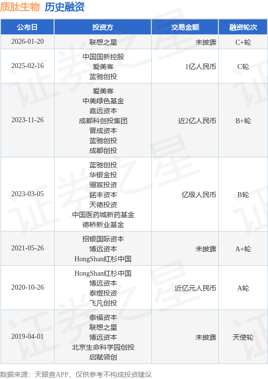 证券之星消息,根据天眼查APP于1月20日公布的信息整理,北京质肽生物医药科技有限公司C+轮融资,融资额未披露,参与投资的机构包括联想之星。