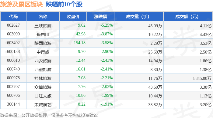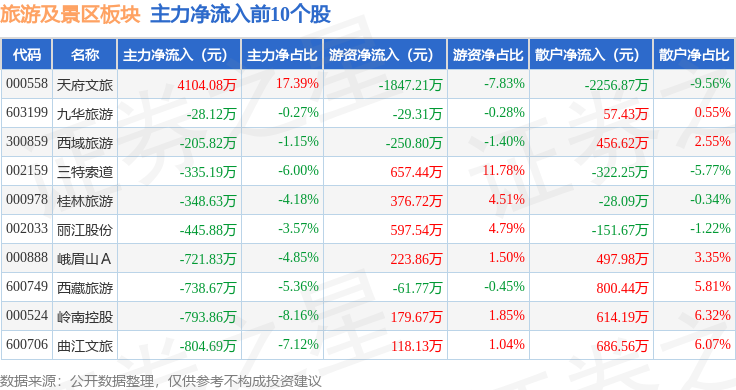 从资金流向上来看,当日旅游及景区板块主力资金净流出4.4亿元,游资资金净流入2196.51万元,散户资金净流入4.18亿元。旅游及景区板块个股资金流向见下表: