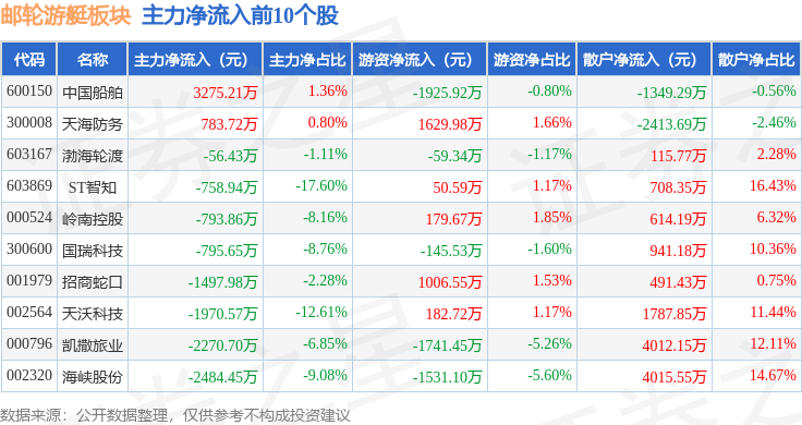 从资金流向上来看,当日邮轮游艇板块主力资金净流出3.58亿元,游资资金净流出1.2亿元,散户资金净流入4.79亿元。邮轮游艇板块个股资金流向见下表:
