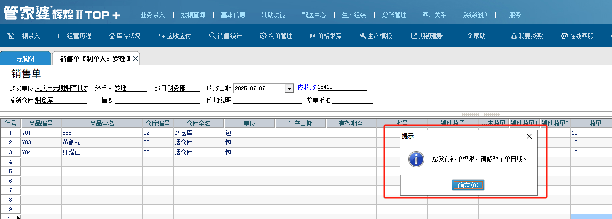 解决方法2:修改单据的录单时间为最后一张单据的时间或者之后的时间,比如当前系统时间是2025年7月7号,经营历程和草稿中最后一个单据的时间是7月2号,没有补单权限就不能做7月1号的单据,需要把录单时间改为7月3号或者更靠后的日期就可以了。