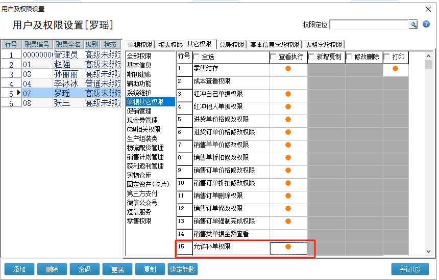 解决方法1:用管理员账号登录软件,登录后点击系统维护-系统管理-用户及权限设置,选择对应的操作员点其他权限-单据其他权限-勾选允许补单权限。