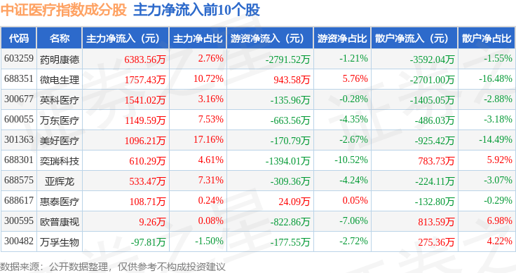 资金流向方面,中证医疗(399989)指数成份股当日主力资金净流出合计14.31亿元,游资资金净流入合计2.11亿元,散户资金净流入合计12.2亿元。成份股资金流向详情见下表: