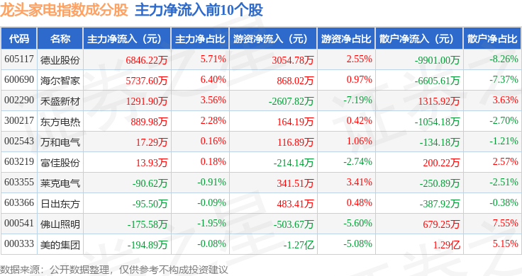 资金流向方面,龙头家电(980028)指数成份股当日主力资金净流出合计5.04亿元,游资资金净流出合计1.38亿元,散户资金净流入合计6.42亿元。成份股资金流向详情见下表: