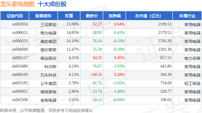 龙头家电(980028)指数十大成份股详情如下: