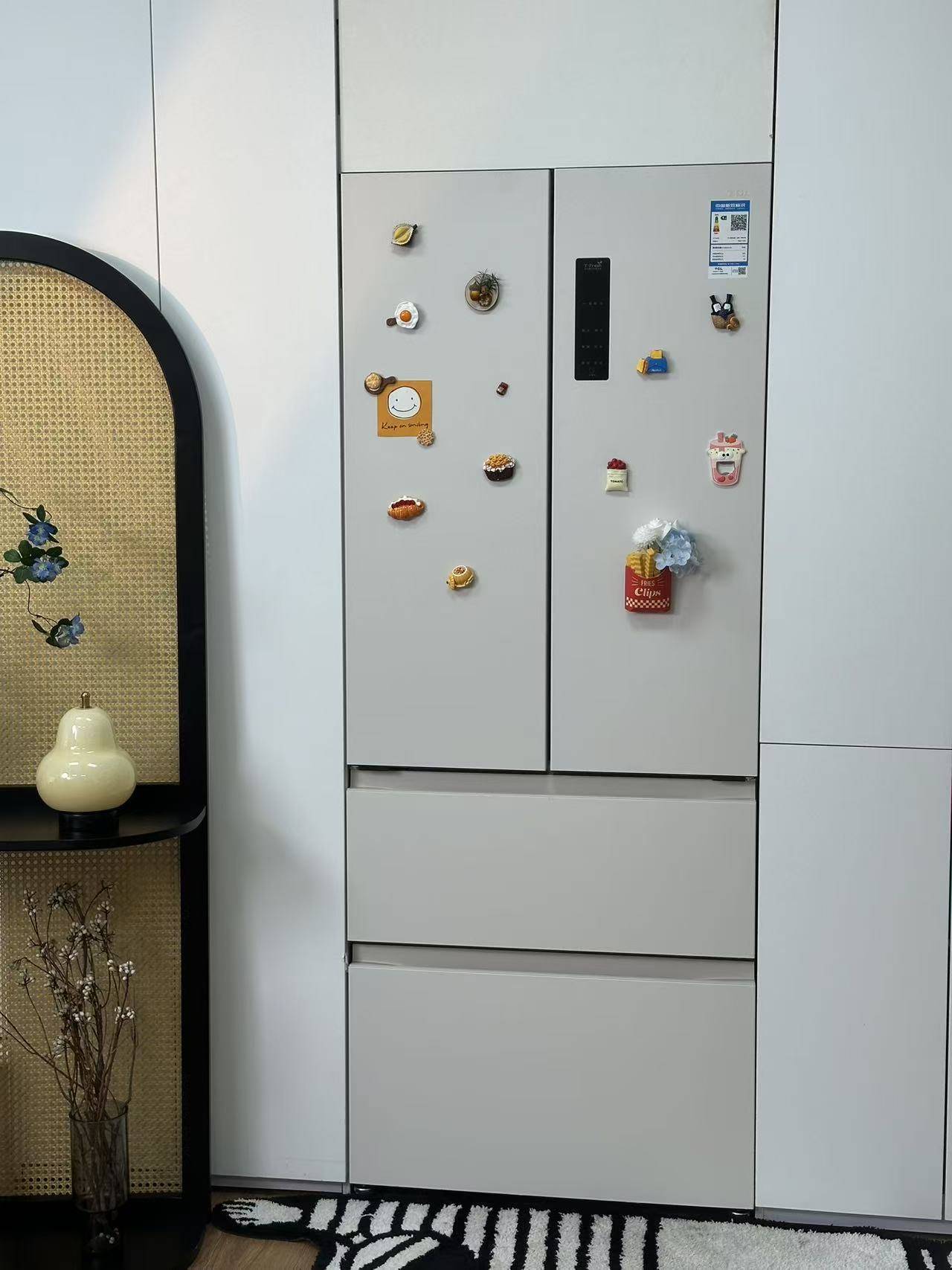 颜值方面也很适配小户型。我家厨房只有 4㎡,58cm超薄机身 TCL 冷布丁,完美塞进预留的位置,两侧不用留散热空间,门还能 90° 打开。丝绒杏的肤感面板摸起来温润,贴几张可爱的冰箱贴,直接成了厨房的小亮点。