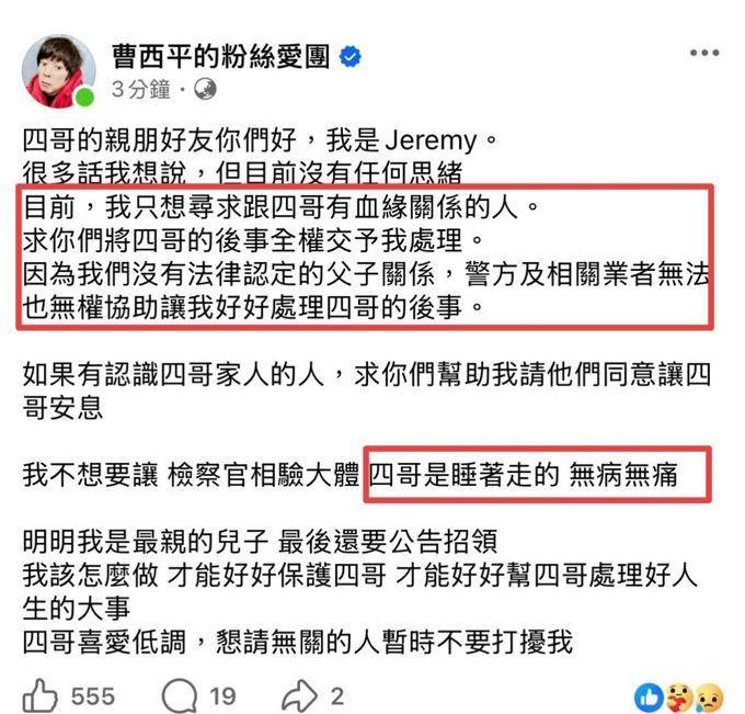 现阶段,曹西平三哥的配偶龙千玉已经给予Jeremy协助处理后续事宜的权限,警方也已初步排除了外界的干预,具体死因还需由检方进一步调查。