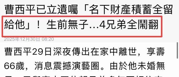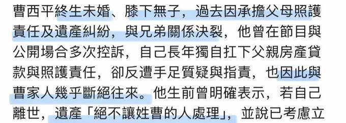 曹西平可能早已预见到自己将会突然离世,因此他提前做好了遗嘱。由于生前与其他兄弟关系破裂,再加上他一生都是单身,没有子女,他将所有的遗产都留给了他的干儿子Jeremy,这也是他多年来对自己的关心和回报。