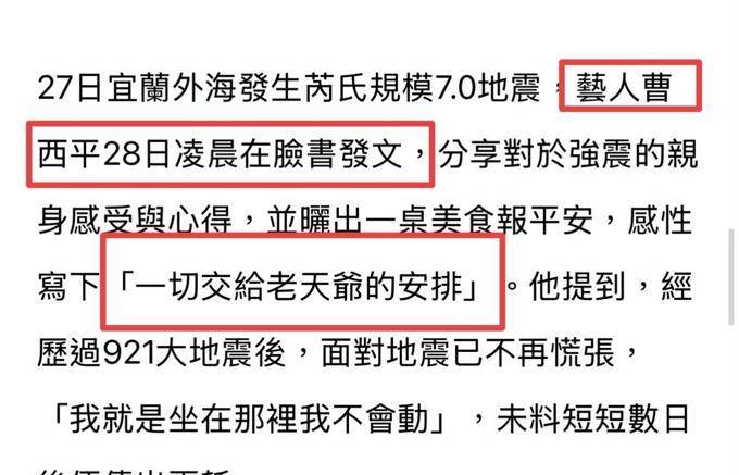 令人 震惊的是,在曹西平 逝世 前的两天,他在社交 媒体上发布 了与地震 有关 的消息,并 宣称“一切 都是上天 的安排”, 但出乎意料的是,这句话变成 了预言, 那句叹 息也变成了 事实。