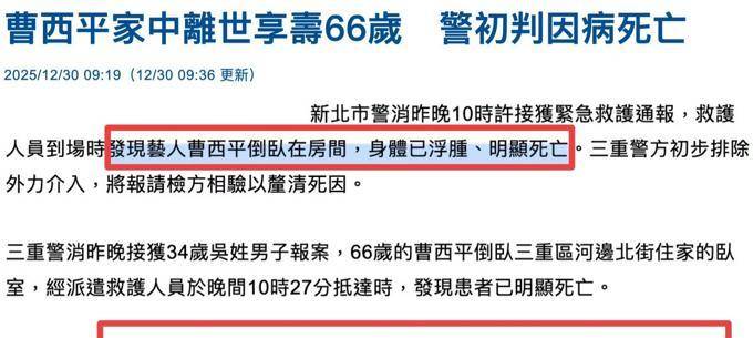 12月29日晚,台媒发布悲痛消息,66岁台湾省资深艺人曹西平倒卧在三重区住所卧室中,被发现时已无生命体征,遗体出现明显尸斑与僵硬,身体浮肿迹象明显,消息引发关注。