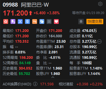 1月23日消息,阿里巴巴-W(9988.HK)高开3.88%报171.2港元,成交额逾8亿港元。隔夜美股市场阿里巴巴收涨5%报177.18美元。