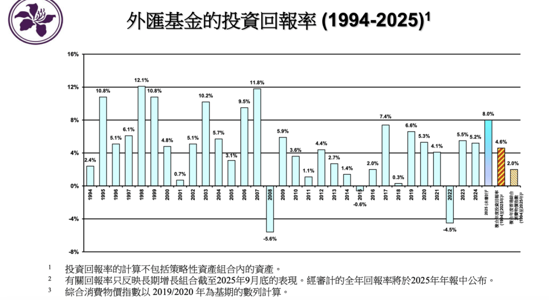 自1994年至2025年,外汇基金的复合年化投资回报率为4.6%,超越同期的复合年化通胀水平2%。