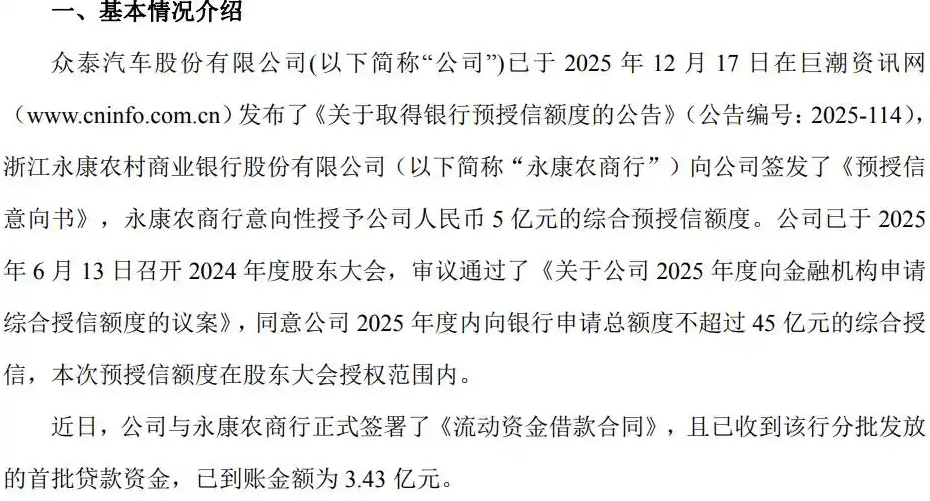 除了招兵买马外,众泰汽车似乎还拿到了一定的资金用来解渴。在众泰汽车披露的《关于取得银行贷款并部分到账的公告》中显示,该公司与浙江永康农村商业银行签署了4亿元《流动资金借款合同》,且首批3.43亿元已到账,资金将定向用于置换已和解的历史逾期债务以及支持整车板块复工复产。