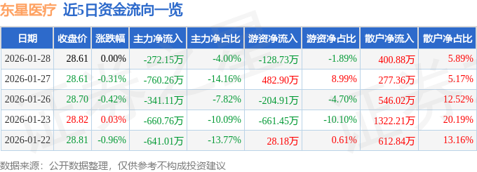 证券之星消息,截至2026年1月28日收盘,东星医疗(301290)报收于28.61元,上涨0.0%,换手率3.47%,成交量2.36万手,成交额6809.51万元。