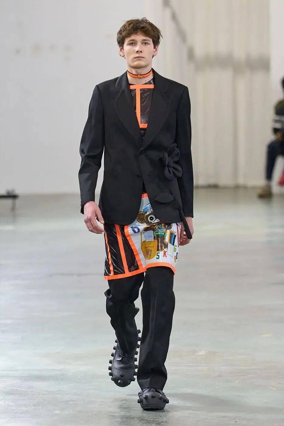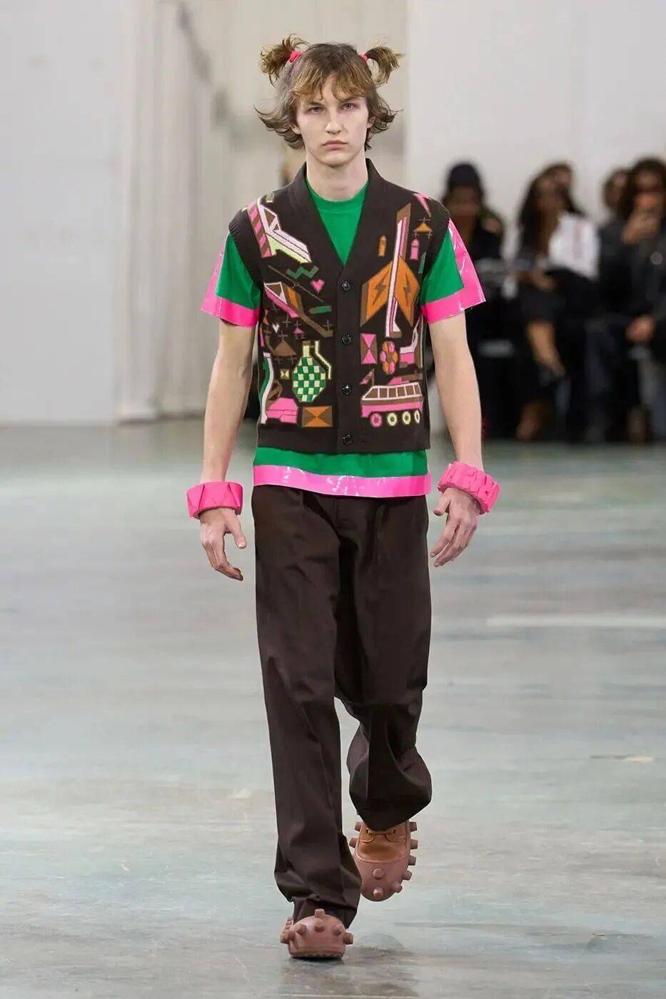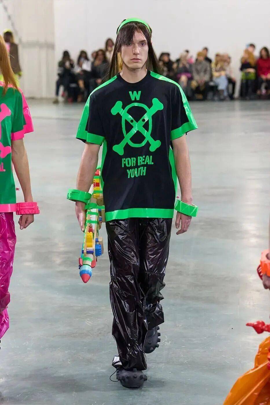 系列忠于张扬怪诞视觉 DNA ,以极致耀眼色彩炸裂全场。模特握玩具水枪与毛绒武器出场,呼应 Eastpak 双肩包。衣物像披覆在身体上的灵魂罩衣。 3D 打印花朵与 Eastpak 罩衫组合。英国羊毛与工业胶带、尼龙碰撞,锻造都市战甲。伴随 Puk Puk 回归,色彩斑斓的 Scarecrows 真实存在。