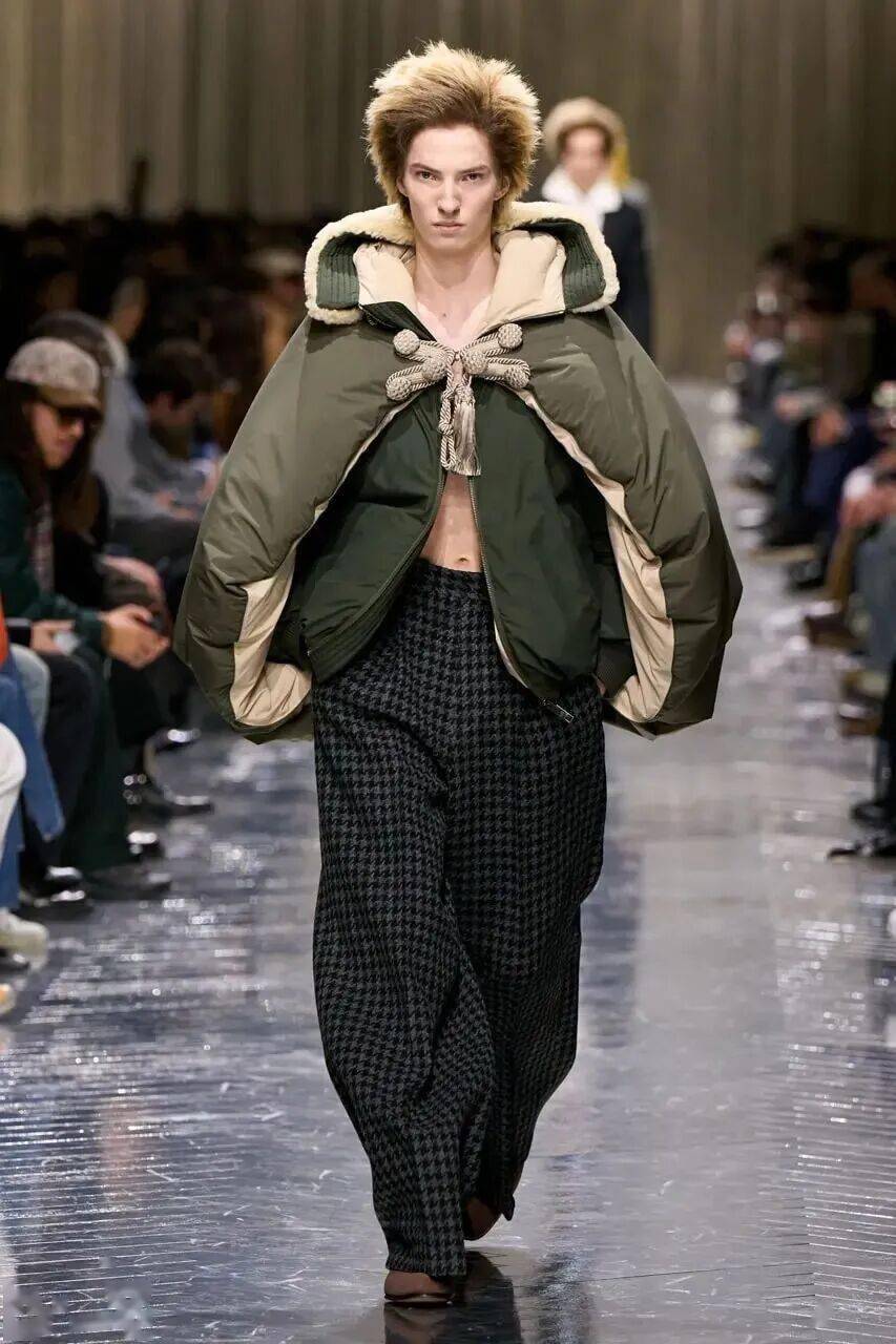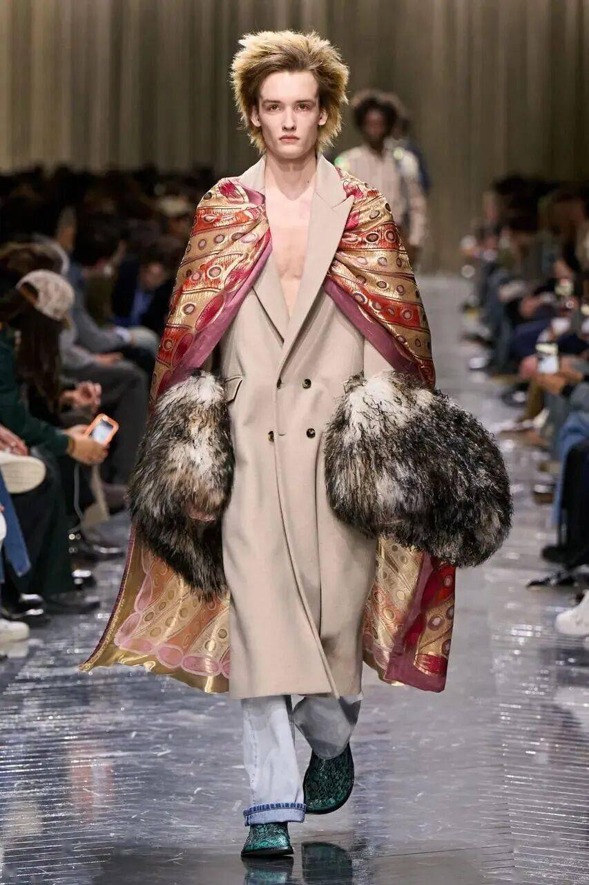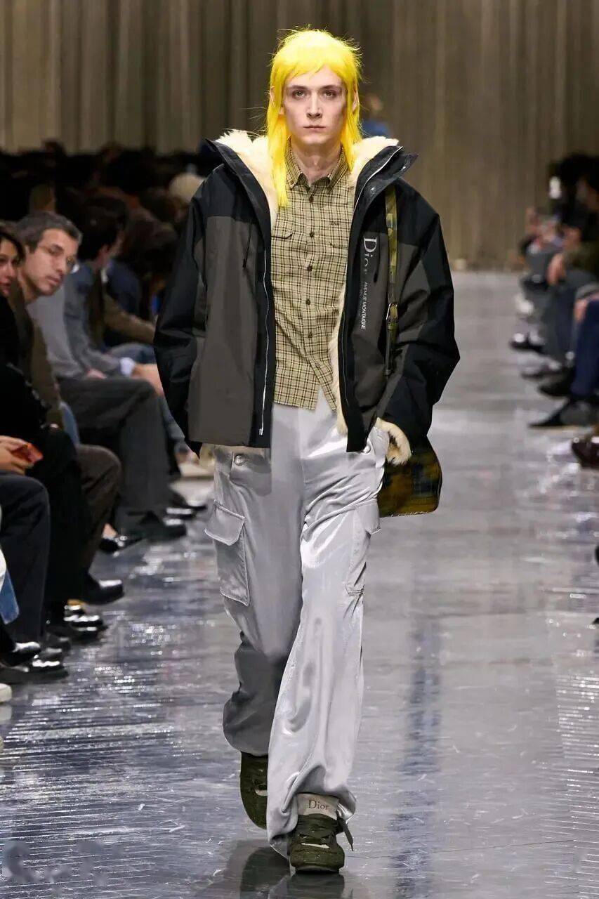 Anderson 将上流社会的富丽底色嫁接锋利边缘感。利落纤细的剪裁与牛仔、派克大衣激烈碰撞。系列有意模糊男性/女性的二元界线,正式感十足的 lavallière 系带衬衫意外搭配连体保暖内裤。最终,系列有意搁置财富符号,聚焦赤裸而私人的古怪气质。对当代 Dior 男士而言,精心打扮是一场不设边界、任性生成的联想游戏。