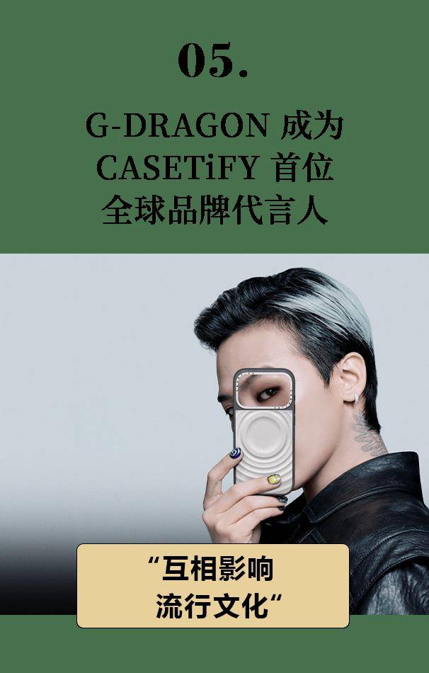 为庆祝品牌成立 15 周年,CASETiFY 宣布任命音乐与时尚先锋 G-DRAGON 为首位全球品牌代言人。双方基于对创意表达的共同追求达成合作,G-DRAGON 将以其文化影响力深度参与品牌塑造。