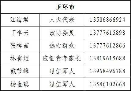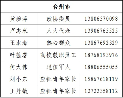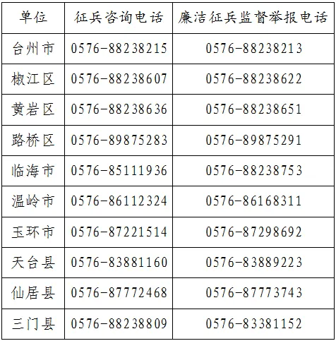 为严明兵员征集纪律规定,筑牢廉洁征兵底线,增强征兵工作透明度,自觉接受人民群众监督,保证全市征兵工作公开、公平、公正,现依法将台州市政府、县(市、区)政府两级征兵办公室监督举报电话和廉洁征兵监督员电话予以公布。