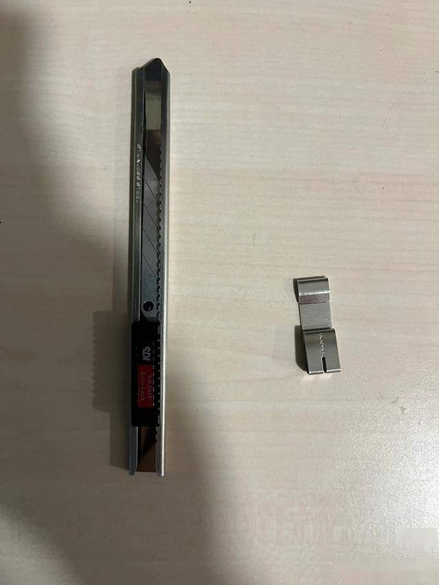 美工刀的尾部有一个卡槽,这个卡槽正好能够将美工刀前端的刀片卡进去,轻轻一掰就将刀片掰断了,这样更换刀片十分简单。