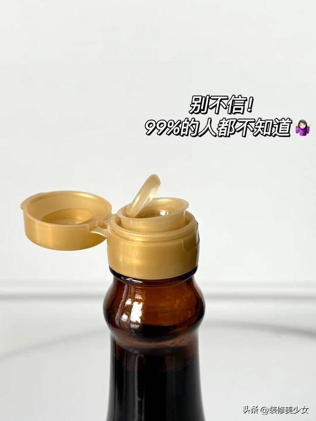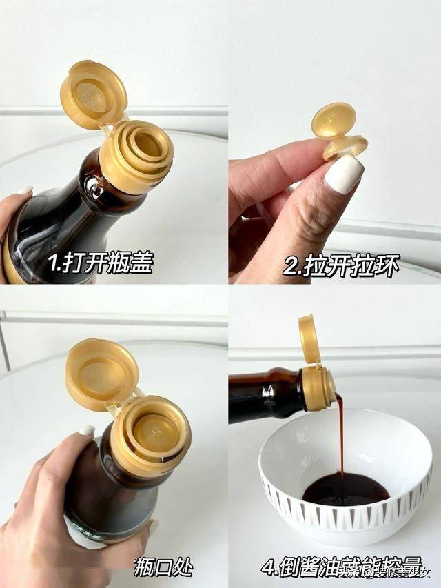 但其实设计并没有问题,是你不会用,像这种带有拉环的酱油瓶子,我们可以将拉环取下来之后反过来扣在酱油瓶子里面,这样就能控制用量了。