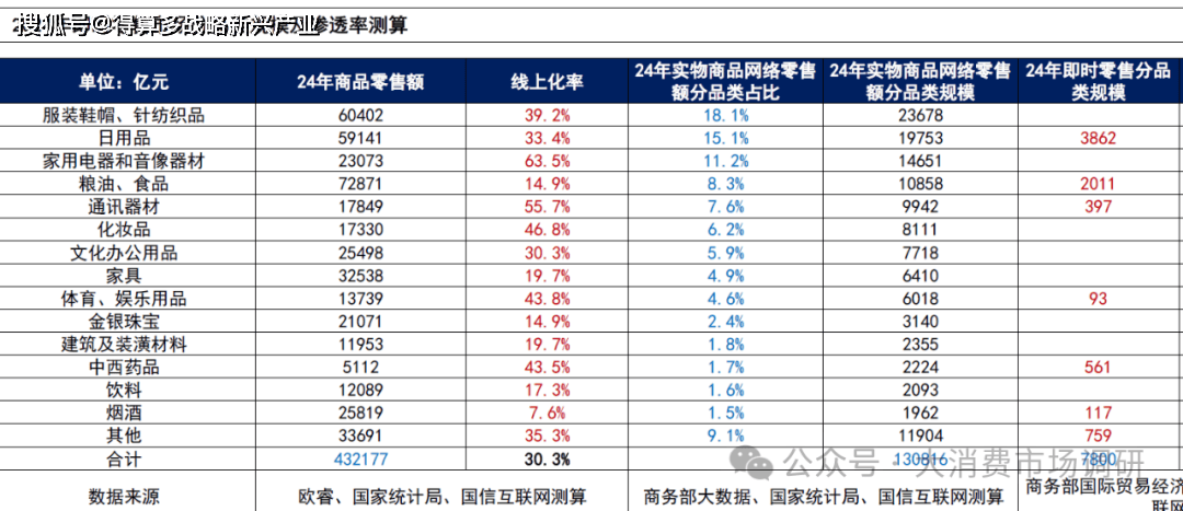 • 预计24年即时零售市场规模(7800亿) = 商品零售额(43万亿)x 电商线上化率(30%)x 电商中即时零售渗透率(6%)。我们按照国家统计局商品分类方式对即时零售市场进行分品类测算: