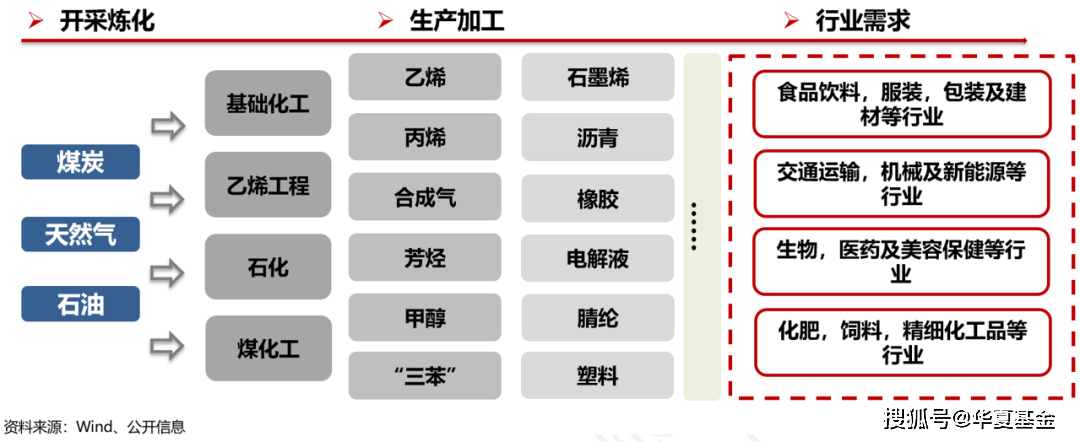 先简单介绍下它们在产业链上的关系,如果说有色金属偏重的是“从石头里炼金属”,那石化专注的就是“把黑油变成万物”。其实石化和我们生活的关系是非常密切的,从石油、天然气等能源的发掘开采,到进一步的加工分离,最终面向的需求端覆盖面很广,衣食住行都涵盖了。